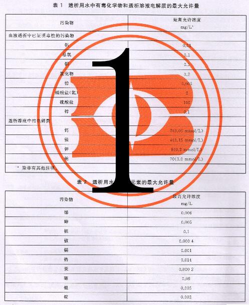 透析用水中的細菌總數(shù)應不超過100cfu/ml,干預水平為最大允許程度的50%,而透析用水中的內(nèi)毒素含量應不超過0.25EU/ml,干預標準同上。而透析用水中的化學污染物的濃度則不能超過下表的規(guī)定。