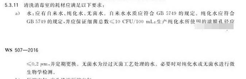 根據(jù)《WS 507—2016軟式內(nèi)鏡清洗消毒技術(shù)規(guī)范》的要求,水:應有自來水、純化水、無菌水。其中,自來水水質(zhì)應符合GB5749《生活飲用水衛(wèi)生標準》的規(guī)定。純化水應符合GB5749的規(guī)定,并應保證細菌總數(shù)≤10cfu/100mL;生產(chǎn)純化水所使用的濾膜孔徑應≤0.2μm。無菌水為經(jīng)過滅菌工藝處理的水,必要時對純化水或無菌水進行微生物學檢測。