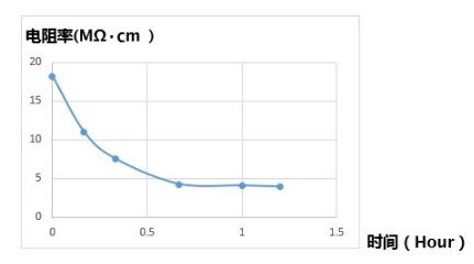 當(dāng)超純水開始曝露在大氣下時,二氧化碳的溶解就會無可避免的持續(xù)下去,我們可以用電阻率的變化來監(jiān)測這個過程。實(shí)踐證明15MΩ.cm以上的超純水暴露在空氣中1個小時后水質(zhì)就會下降至4MΩ.cm左右。